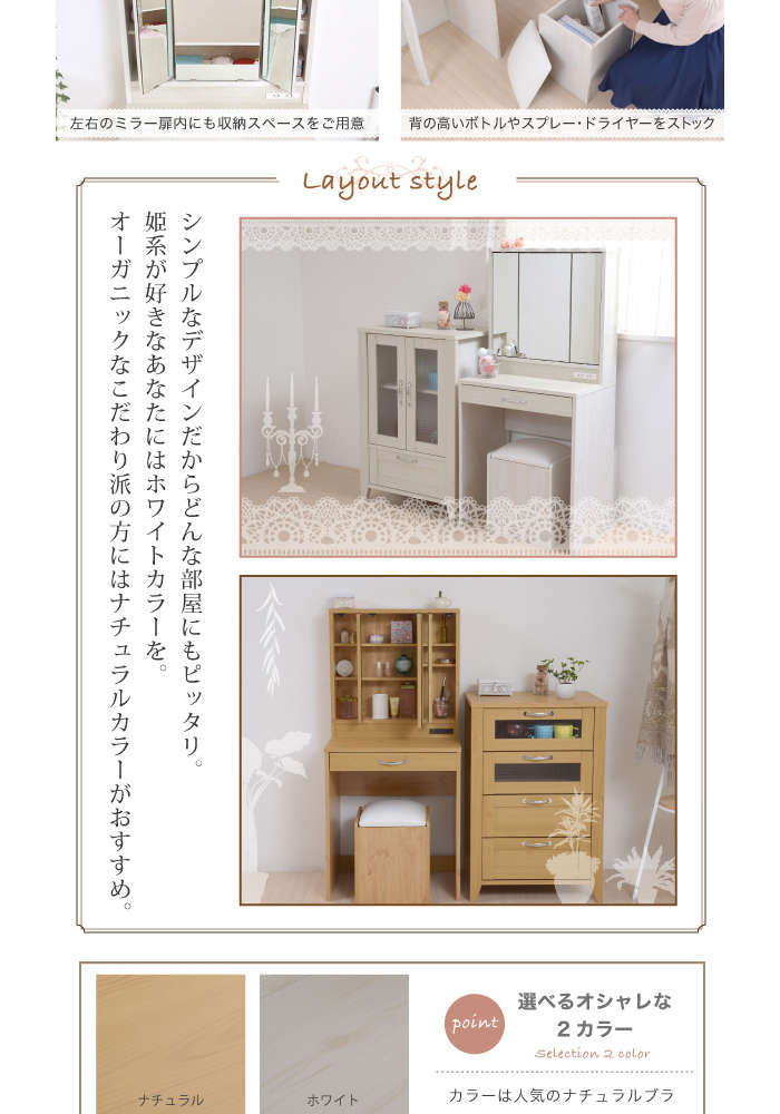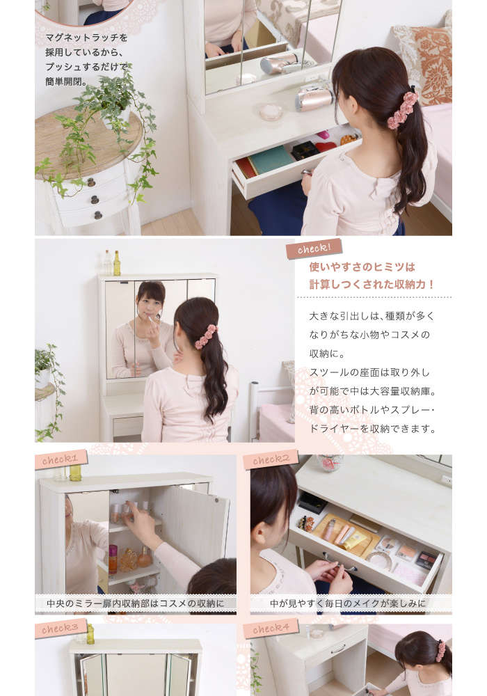 ●浅めの引出しや、収納可能な空間のあるスツール付と、コンパクトながら収納空間充実の仕様となっています