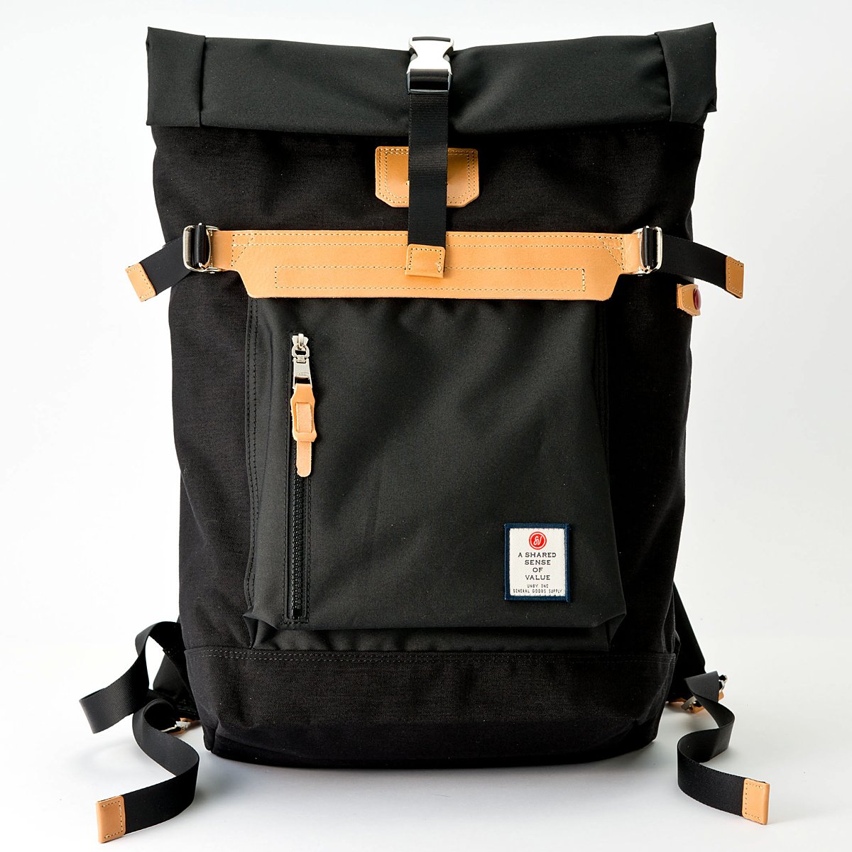 Impression of an adult 's backpack with feeling of luxury using silver as a fastener of a roll top.