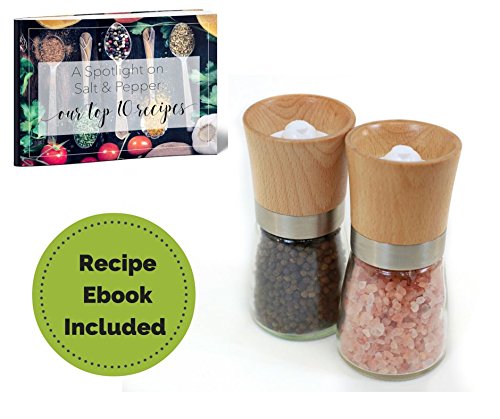 - ELEGANT DESIGN With its classic beech wood top, glass body and ceramic grinder, this unique duo is an elegant, sleek and organic looking addition to any kitchen. No tacky electrical grinders here means no batteries required--only a few effortless twists with your hand to experience that fresh himalayan salt, pepper, or other spice.