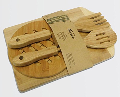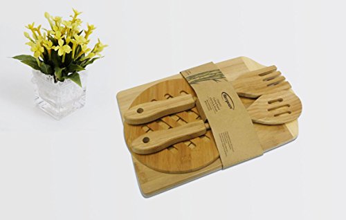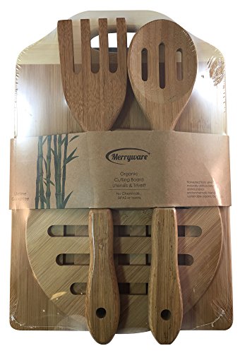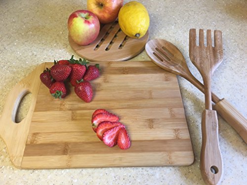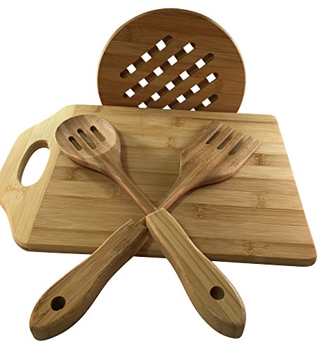 Beautiful Natural Organic Bamboo Wood Kitchen Countertop Cutting Board Set with Bonus Utensils and Trivet. Best Housewarming, Weddings, Chef's or Hostess Gift.!