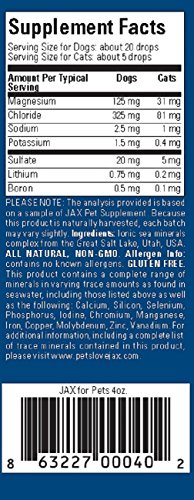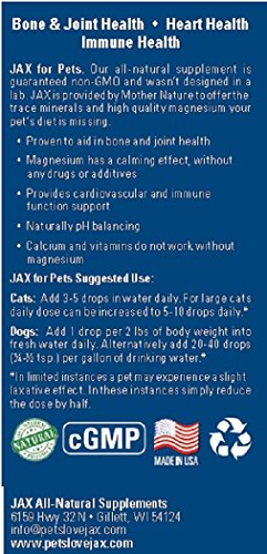 Dogs and cats are more than just pets, they are family. You love your furry friend, and want to give your smallest family member the very best that Mother Nature has to offer. Unfortunately, most pet foods are lacking in the nutrients our pets require. Luckily, JAX for Pets is a simple and inexpensive way to offer our loyal companions a naturally occurring blend of over 70 different ionic trace minerals and high quality magnesium. Keep your pets happy and healthy, and take comfort in knowing that you are doing all you can for your pets. Prevention is better than costly treatment every time.Feature