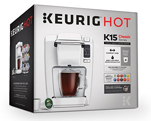 A compact personal coffee maker. The Keurig K15 brews over 500 different K-Cup pod varieties from 75 brands including Green Mountain Coffee, Starbucks, Lipton, and more. Enjoy coffee, tea & hot cocoa at the push of a button with the quality you expect from Keurig. When space and portability are important, choose the Keurig K15 personal brewer.Feature
