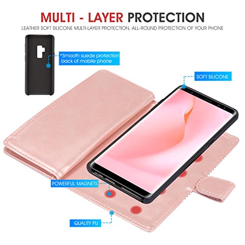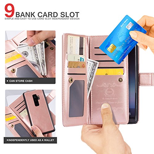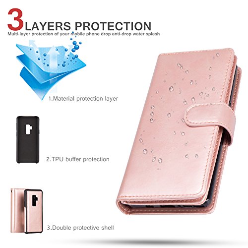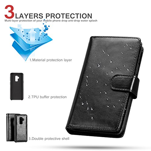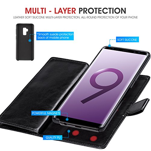 -. Feature : PERFECT FIT for Samsung Galaxy S9 Plus. / Material: high quality PU Leather, Magnets and PC, non-toxic and environmentally friendly. / 9 Card Slots for credit card, ID or cash, 1 with view window can place your favorite photo. / The most card slot designed case on the market, with wriststrap for easy carrying, removable design to conveniently anwser phone. / 360 PROTECTION - Provides excellent protection and prevents scratches, finger P.R.Int, dirt and daily wear and tear from accumulating.