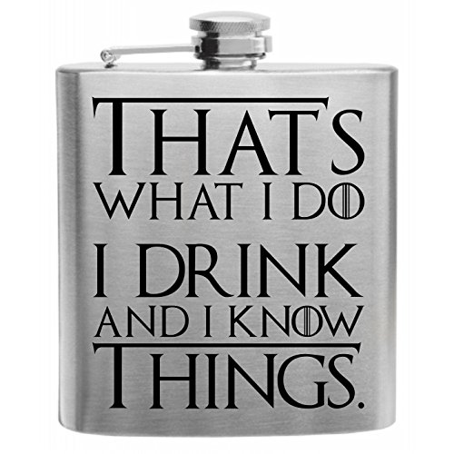 -. Brand : crown -. Color : Stainless Steel -. EAN : 0689214267395 -. Feature : Perfect gift for any occasion! :) / have the coolest flask at the party! -. Model : FSKROB1 -. MPN : FSKROB1 -. PackageQuantity : 1 -. PartNumber : FSKROB1 -. ProductGroup : Kitchen -. ProductTypeName : KITCHEN -. Size : 4 1/4(H) X 3 3/8(W) X 7/8(D) -. Title : Tyrion Lannister that's what i do i drink and i know things Stainless Steel Hip Flask 6oz Gift -. UPC : 689214267395