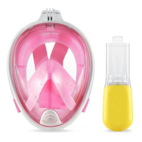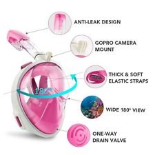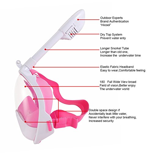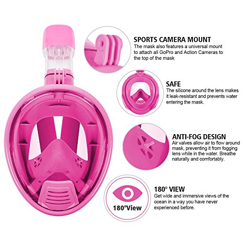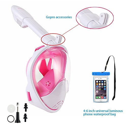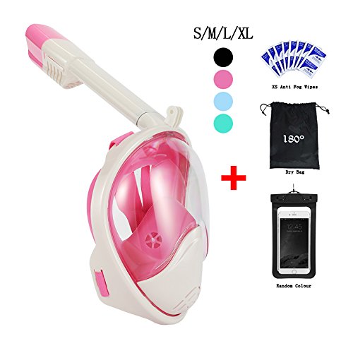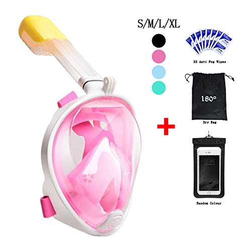 Snorkel Mask 180° view for Adults and Youth. Full Face Free Breathing Design.[Free Bonuses] Cell Phone Universal Waterproof Case (Dry Bag) and Anti-Fog wipes (White/Pink, S/M)