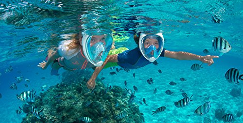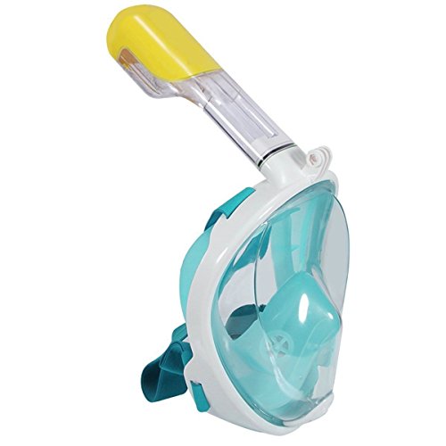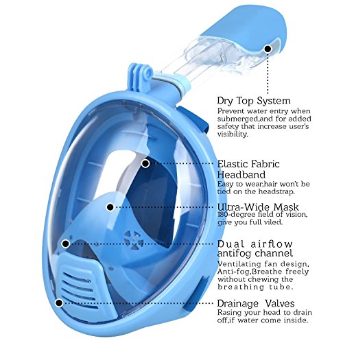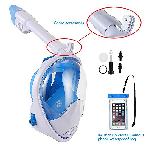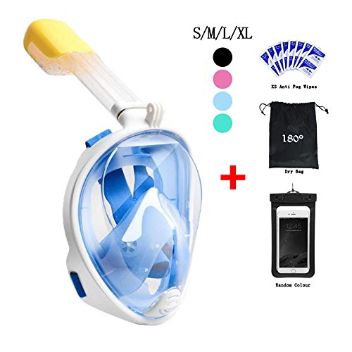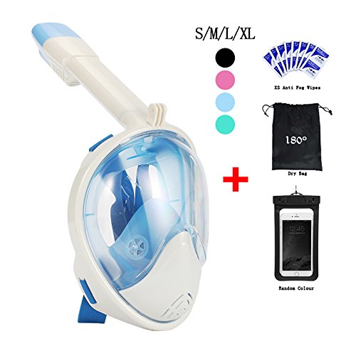 Snorkel Mask 180° view for Adults and Youth. Full Face Free Breathing Design.[Free Bonuses] Cell Phone Universal Waterproof Case (Dry Bag) and Anti-Fog wipes (White/Blue, L/XL)