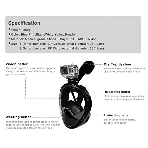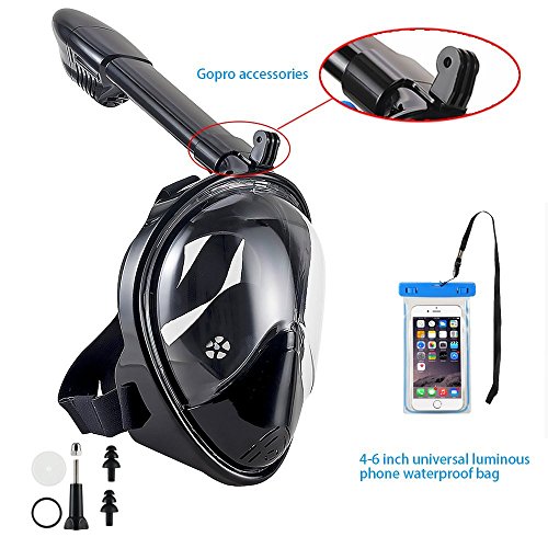 Snorkel Mask 180° view for Adults and Youth. Full Face Free Breathing Design.[Free Bonuses] Cell Phone Universal Waterproof Case (Dry Bag) and Anti-Fog wipes (Black/Blue, S/M)