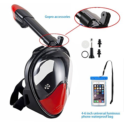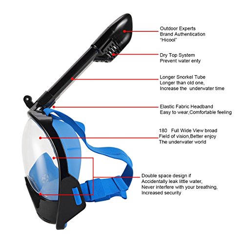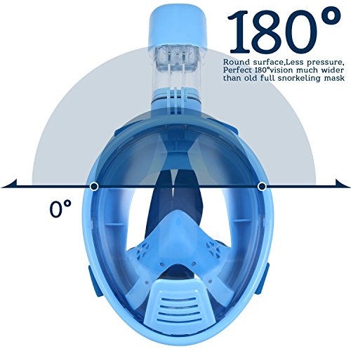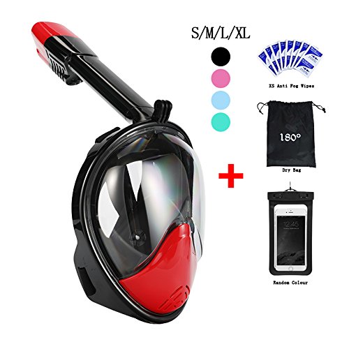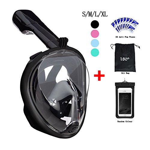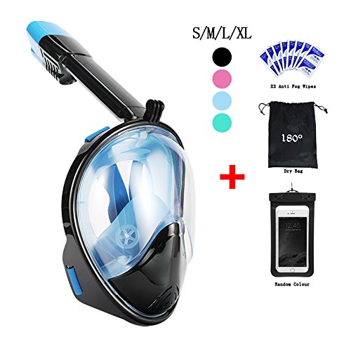 Snorkel Mask 180° view for Adults and Youth. Full Face Free Breathing Design.[Free Bonuses] Cell Phone Universal Waterproof Case (Dry Bag) and Anti-Fog wipes (Black/Blue, L/XL)