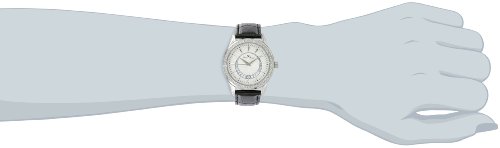 Silver textured dial with silver tone hands and hour markers; luminous; stainless steel bezel encrusted with white crystals