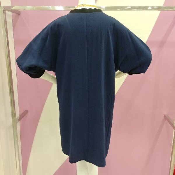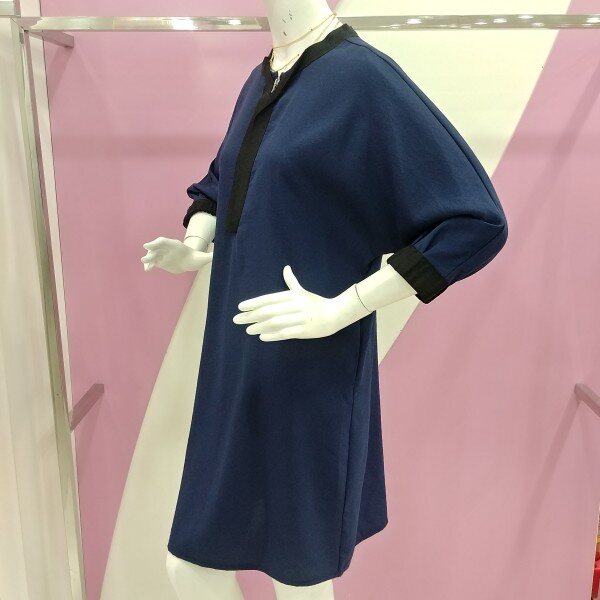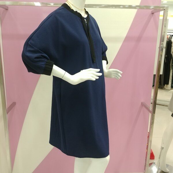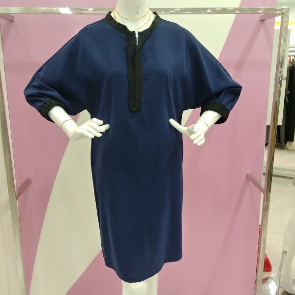 7부 소매기장으로 네이비 색상에 넥과 소매부분을 블랙으로 포인트를 준 원피스.루즈핏한 스타일로 편하게 착용가능한 원피스.정사이즈 구매.