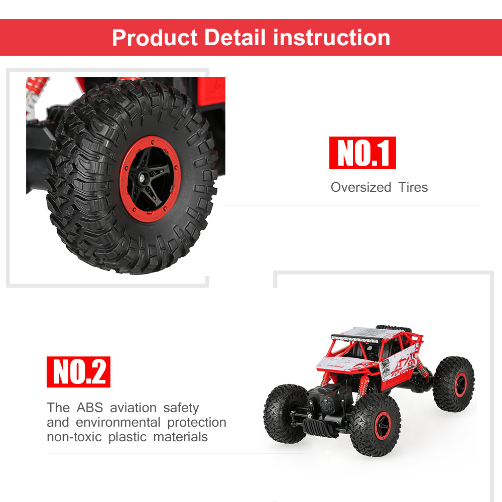 This 2.4GHz 4WD 1/18 scale rock crawler car features of forward, backward, turn left, right, the whole car has four wheel drive the ability to develop the intellectual development, hands and brain, parent-child communication, interest cultivation, interactive toys, grip, hand eye coordination, and other abilities. Besides, the car with dozens of screws, which can ensure a stable solid, and with high quality raw materials, more durable crashworthiness. Super-strong anti-collision struction is designed according to the structure of the car model, which is shock-resistant and anti-falling and makes the car have better performance during the process of driving.