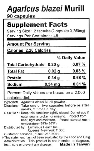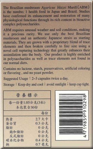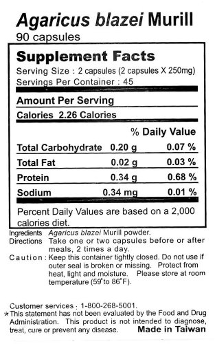 -. Title : Agaricus Blazei Murill (Brazilian Mushroom) - 99.3% rDNA proven authentic - 90 capsules per bottle, 350mg per capsule - Made in Taiwan