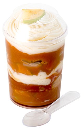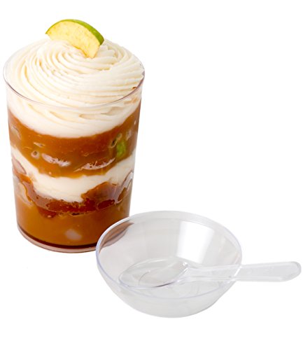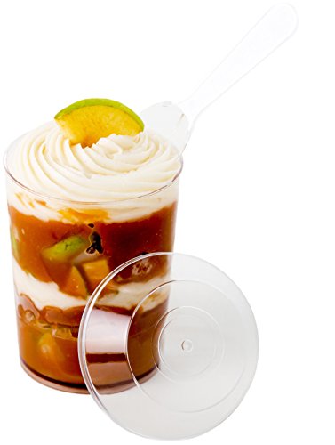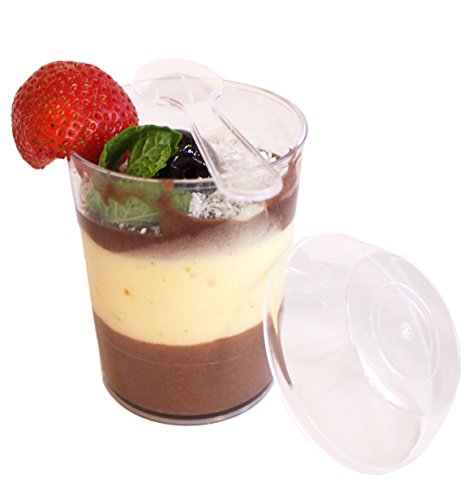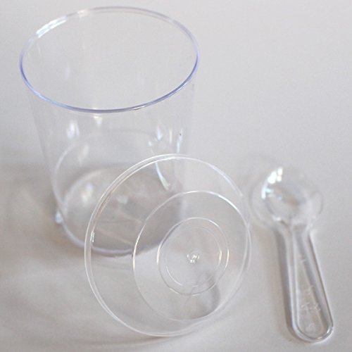 - Feature : SupaCute Desserts (TM). Clear plastic dessert cups with snap lid food containers and mini tasting spoons set of 25 parfait glasses with 25 lids and 25 serving spoons. Capacity 3.38 ounce. These dessert cups are made from hard crystal clear food grade plastic BPA free, disposable, reusable, washable, recyclable durable and freezable. Height: 2.75 inch, top diameter 2.08 inch and bottom diameter: 1.77 inch. / Elegant round shape tumbler cups set of 25 count used as tiramisu cups or pudding cups, 25 count parfait spoons or appetizer spoons and 25 count lids used also as small appetizer plates. They are the perfect party and household supplies for baby showers, new year's eve, retirement, carnival and much more. / Great dessert bowls and jello shot cups with lids which the lids can be used as dessert plates or catering plates as well as appetizer plates for hors d'oeuvre, tiny food party and for your candy buffet. / The most popular verrine size and shape food containers dessert glasses and parfait cups in catering supplies. These parfait glasses and jello shooter cups are the ideal catering dishes and party cups for your chocolate mousse, yogurt parfait, pudding, semifreddo, jello shots and any mini desserts. / 30-DAY MONEY BACK GUARANTEE & PROMO: See promotion below for your discount when purchasing 2 or more SupaCute Desserts (TM) clear plastic dessert cups with snap lid food containers and mini tasting spoons set of 25 parfait glasses, 3.38 oz. Promotion applied automatically at the time of purchase. Get yours now!