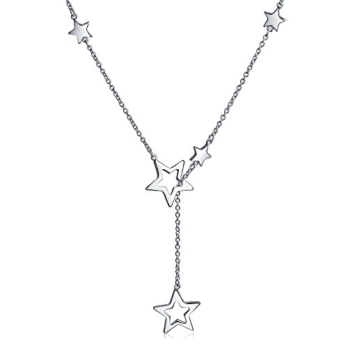 Bling up your look, star style. This beautiful open star lariat necklace is made of solid .925 Sterling Silver with rhodium plating to maximize luster and resist tarnish. Seven mini silver stars and two larger open star shapes deck out this adjustable, 19 inch lariat chain with a lobster claw clasp. Star it up with matching dangling earrings for a night on the town, red carpet style. This shining lariat style star pendant necklace will bring out the celebrity in anyone.