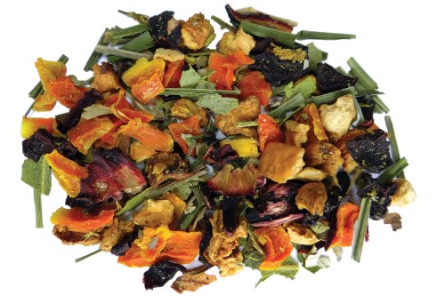 -. Feature : All Natural Ingredients / 100% Caffiene Free / Ingredients: Apple Pieces, carrot flakes, blackberry and eucaluptus leaves, beetroot pieces, hibiscus flowers, lemon grass, flavoring, tangerine and orange slices. / Each Ounce Makes approx 10 cups. / Steeping Sestion: 1 1/2 tsp per 8oz water @ 212 degrees for 5-10 min