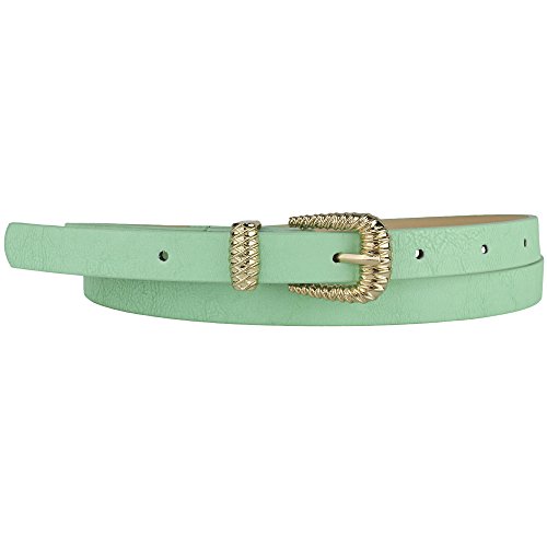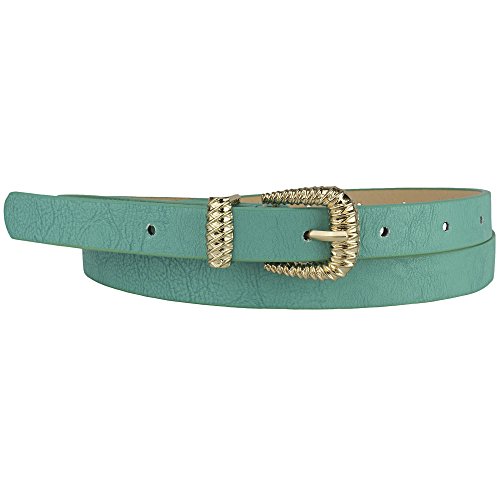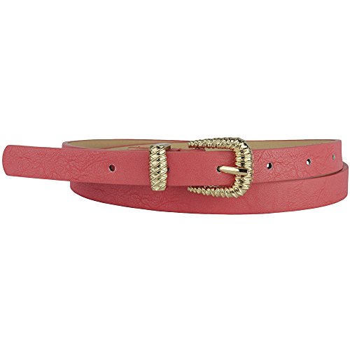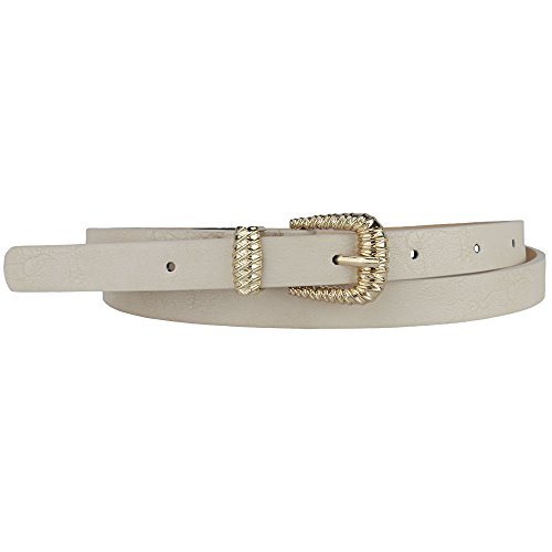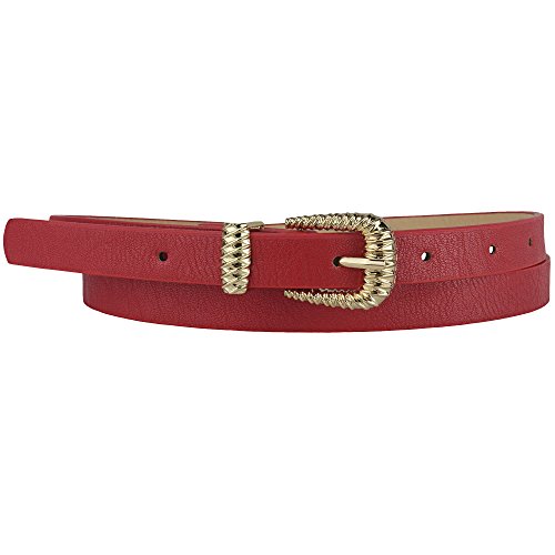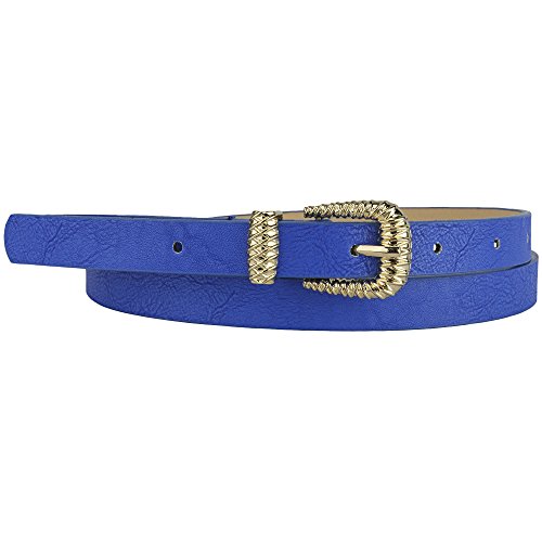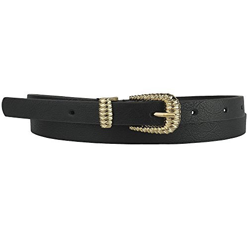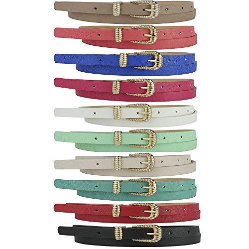 This belt is classically simple, but a must-have for any fashionable wardrobe. The gold buckle with it's textured detail shows off the quality construction and style. Always trendy, a skinny belt is an easy way to finish off an outfit from office, casual and formal wear, and with the variety of colors offered, at an excellent price point- you are likely to find more than one to add to your closet.Feature
