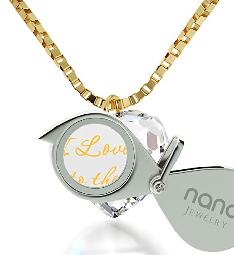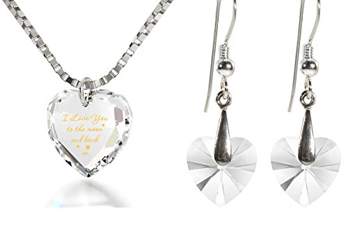I Love You to the Moon and Back necklace and Swarovski crystal heart drop earrings jewelry set. Illuminate love with this divine tiny heart necklace, beautifully inscribed in 24k gold with 'I Love You to the Moon and Back' onto a white crystal Swarovski heart-shaped pendant. This romantic heart charm necklace, is beautifully inscribed using innovative technology, allowing us to write the smallest of text on the surface of the gemstone. The elegant heart shaped Swarovski white crystal stone measures just 0.4x0.5in (10x12mm), while gracefully dangling from a gold filled or 925 sterling silver box chain, measuring 18" (45cm). The romantic charm is sturdily attached to a gold plated or 925 sterling silver jump ring. The incredible love necklace is paired with elegant white swarovski heart crystal earrings measuring 0.4 inches, 10mm, while set in a 925 sterling silver or gold plated pinch bail and measure 1.25 inches, 3.3cm in length, including the 925 sterling silver or gold filled fish hooks. (Please note that only the necklace contains the 24k gold inscription). Size doesn't matter where love blossoms, a small charm with bountiful gesture. If you can't say it enough, show it, with this enchanting, romantic anniversary, valentines day or birthday gift idea. Sure to leave a lasting impression, this elegant charm necklace makes a great gift for any loved one; your wife, girlfriend, best friend, mother or a special treat just for you!Feature