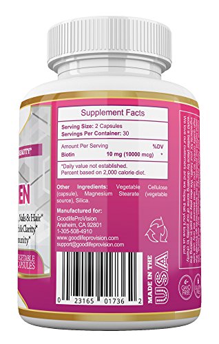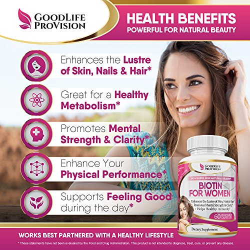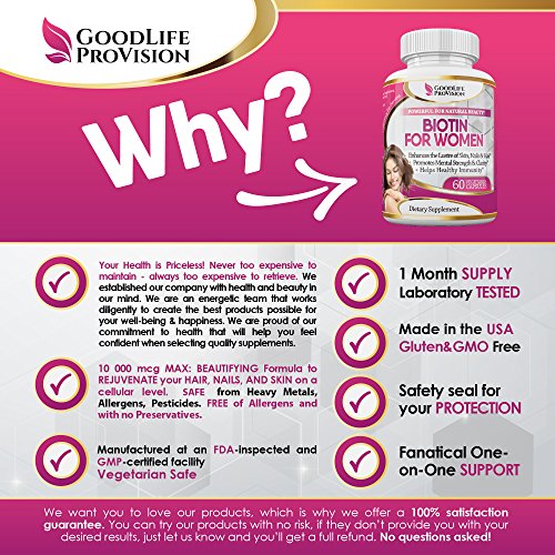 -. Feature : YOUR HEALTH IS P.R.ICELESS: Never too expensive to maintain - always too expensive to retrieve. We are proud of our commitment to providing information and education that will help you feel confident when selecting quality supplements. That's why we include the bonus guides to help you navigate through the world of Health Improvement and Daily Joy. Just contact us after your purchase and we will gladly send them to you. / HIGH QUALITY: Vegetarian Safe. Gluten & GMO Free. Every Bottle goes through rigorous Quality Control and is made in a GMP-quality certified facility in the USA & made in the USA / AN ANTI-AGING FORMULA & IMMUNE SYSTEM ENHANCER: our Powerful for Natural Beauty Biotin is specifically formulated to Help you Support your HAIR & NAILS health and to make your SKIN Glow on a CELLULAR LEVEL, to promote Mental Strength & Clarity and Healthy Metabolism and much More! And finally you can use this powerful Natural Beautifier as a Great tool to enhance your Physical Performance! / ENERGY BOOST IS AN ADDED BONUS. It is such a pleasure to come home after a full day of work, and have the energy and enthusiasm to enjoy the evening! / 10000 MCG PER DAY BEAUTIFYING FORMULA: easy to use and swallow for active women who want to want to set themselves up for success every day. A nice way to get a suitable dose of Biotin for you and enjoy all its benefits. Our Biotin allows you to choose the best dosage for you - 5000 mcg or 10000 mcg. If you prefer to double the dosage, simply take 2 pills (not softgels or gummies) a day!