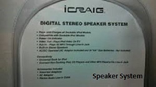 -. Binding : Electronics -. Brand : Icraig -. EAN : 0741725915469 -. Feature : Digital Stereo Speaker System / Plays and Charges all dockable iPod models / Connect non-docking iPod, CD players and other MP3 players via line-in Jack -. Label : Craig Electronics International -. Manufacturer : Craig Electronics International -. PackageQuantity : 1 -. ProductGroup : Network Media Player -. ProductTypeName : PORTABLE_AUDIO -. Publisher : Craig Electronics International -. Studio : Craig Electronics International -. Title : iCraig Stereo Speaker System (Made for iPod) -. UPC : 741725915469