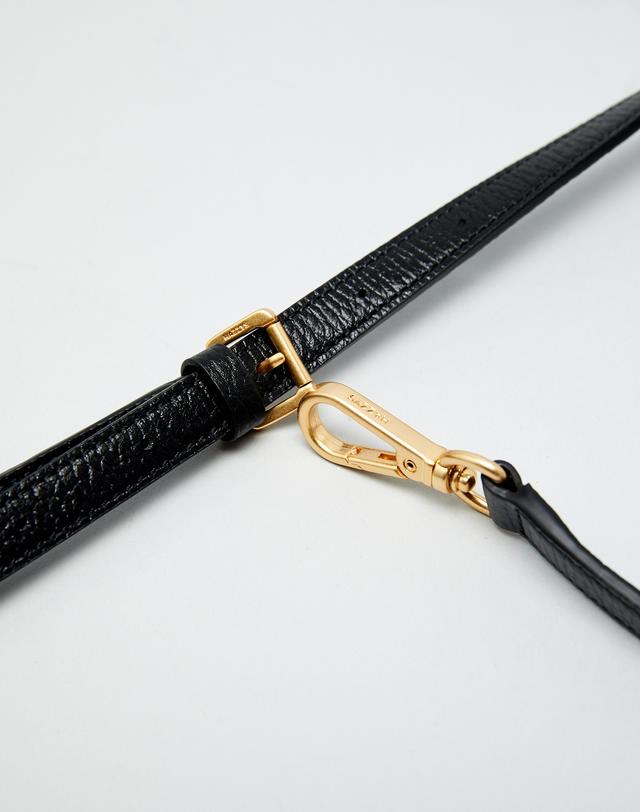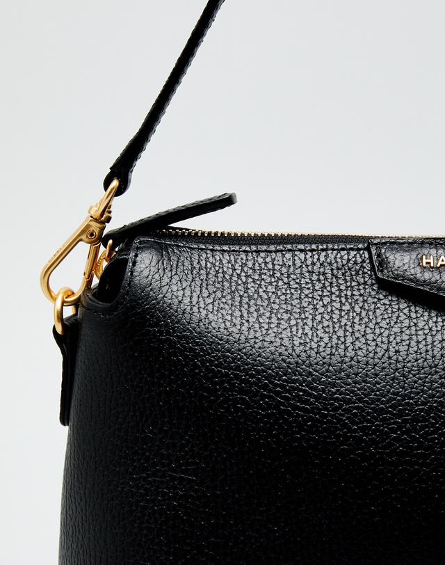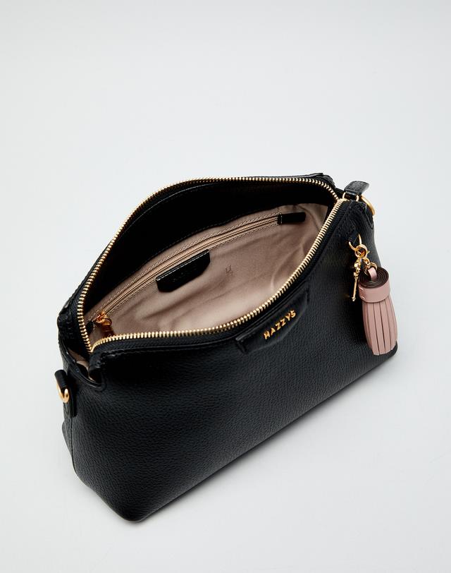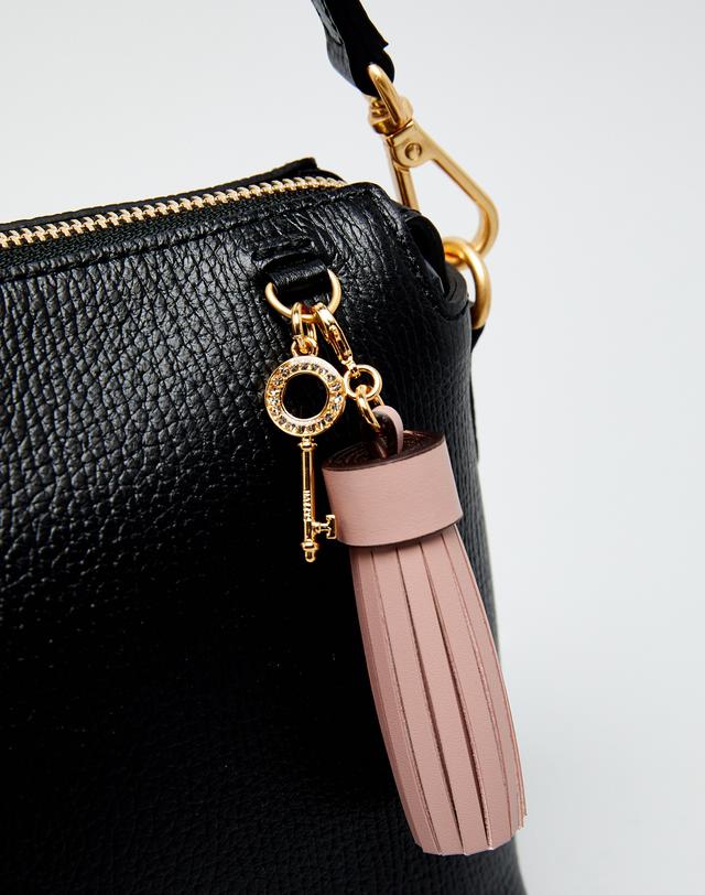 블랙 컬러 바탕에 베이직한 디자인으로 인디핑크 태슬 참 장식과 HAZZYS 골드 로고로 포인트를 준 크로스백 입니다.