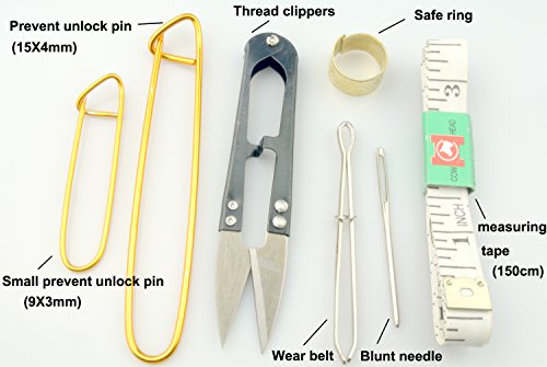 - Pack of 56,10 X multicolor plastic mark pin,4 X silicone needle cap,2 X seam ripper,1 X plastic sewing needle,3 X curvy twist,15 X circular marker,15 X copper pins,1 X prevent unlock pin,1 X thread clippers,1 X safe ring,1 X wear belt,1 X blunt needle,1 X measuring tape.