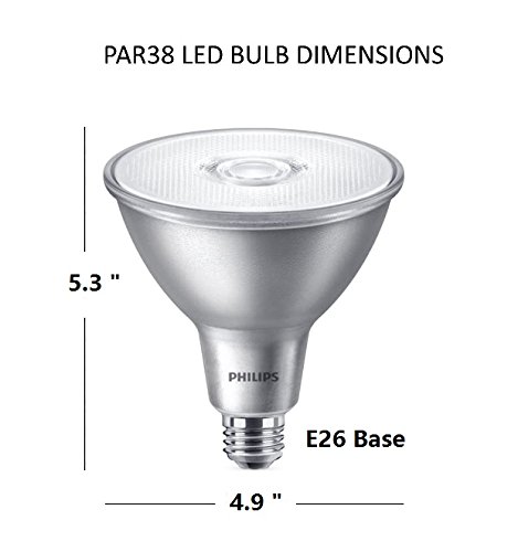 - Philips PAR38 LED classic glass light bulbs spotlight the details in your home with a 40-degree beam angle and 850 lumens of bright white light, equivalent to 120-watt incandescents with 80% less energy use. Appropriate for indoor and outdoor use, these bulbs fit medium base (E26) fixtures and measure 5.6 inches tall with a bulb diameter of 8.66 inches.