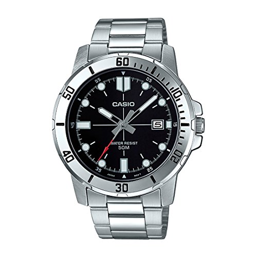 Brand, Seller, or Collection Name:Casio Model number:MTP-VD01D-1EVUDF (A1362) Part Number:MTP-VD01D-1EVUDF (A1362) Item Shape:Round Dial window material type:Mineral Display Type:Analog Clasp:Fold-over-clasp Case material:Stainless steel Case diameter:45 millimeters Case Thickness:10.5 millimeters Band Material:Stainless Steel Band width:18 millimeters Band Color:Silver Dial color:Black Bezel material:Stainless steel Bezel function:Fixed Calendar:Date Special features:n/a Item weight:4.16 Ounces Movement:Japanese quartz Water resistant depth:50 Meters