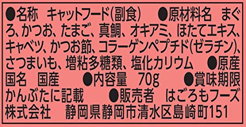 原材料:まぐろ、かつお、たまご、真鯛、オキアミ、ほたてエキス、キャベツ、かつお節、コラーゲンペプチド(ゼラチン)、さつまいも、増粘多糖類、塩化カリウム