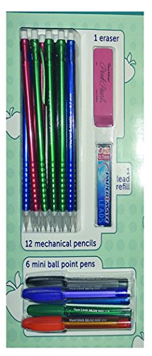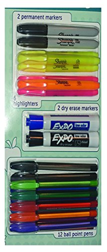 -. Feature : 12 Papermate Mechanical pencils. 6 Sharpie highlighters / 1 Papermate eraser. 2 Expo dry erase markers / 1 Papermate lead refill. 12 Papermate ball point pens / 6 Papermate mini ball point pens / 2 Sharpie permanent markers