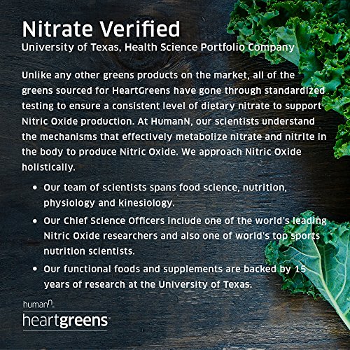 DIETARY NITRATE LEVELS OF 5 SERVINGS OF VEGETABLES: With ingredients like Kale, Spinach, Spirulina, Barley Grass, and Wheat Grass, Heart Greens makes it quick and easy to get your daily source of nitrate from greens.