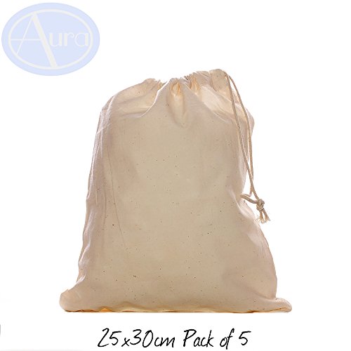 PACK of 5 - Natural COTTON Drawstring Bags. Size: 25 x 30cm (S)