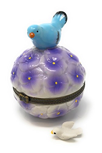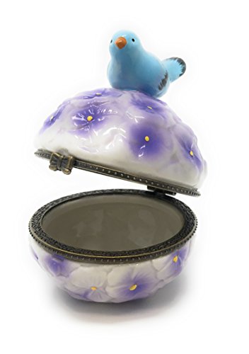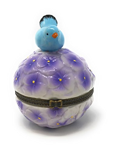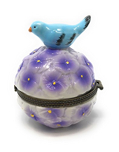 Porcelain Bluebird on Cluster Purple Flowers Round Hinged Lid Trinket Box with Tiny Trinket Inside, By Artgifts, 3.25"H