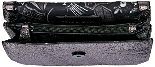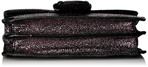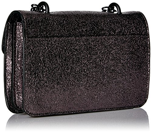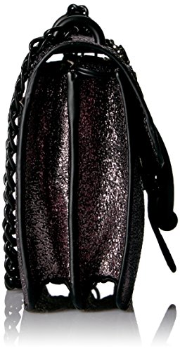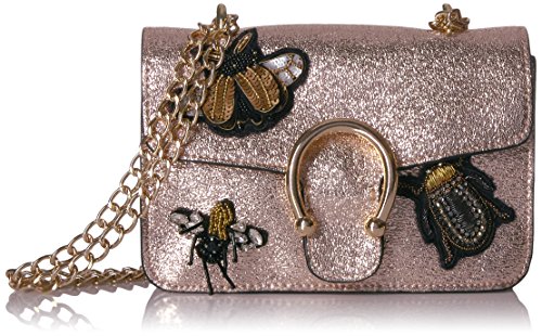 Steve Madden trendy flap bag with patches and applique. Mini chain strap can be worn single for a longer strap or doubled for a shorter strap.