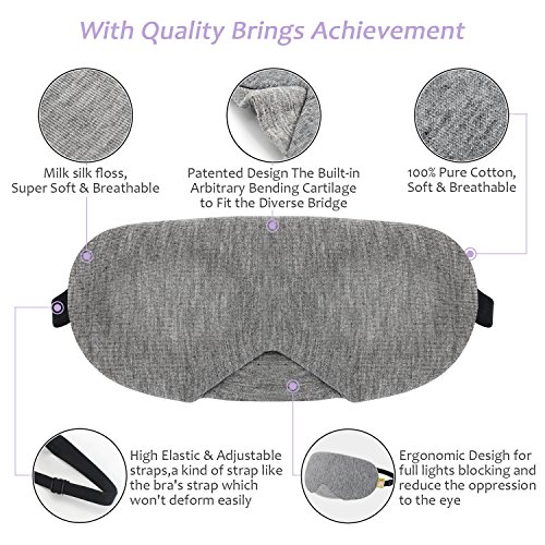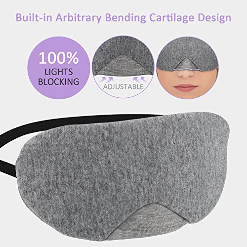100% Blocks All Light: Sleep Mask adopted a patented design "The Built-in Arbitrary Bending Cartilage" to fit the diverse bridge of the nose and achieve 100% light blocking. Super Breathable: Our Sleep Mask 100% made of pure cotton, allowing healthy oxygen in and keeping dry air out. Ideal for dry eye sufferers. Ultra Lightweight: No pressure and ultra comfortable to wear. Making you wake up refreshed and energized! Adjustable: Elastic strip, easy to adjust; No hair tangling and won't fall off when you turn over; One size fits all men, women, teenagers and kids.