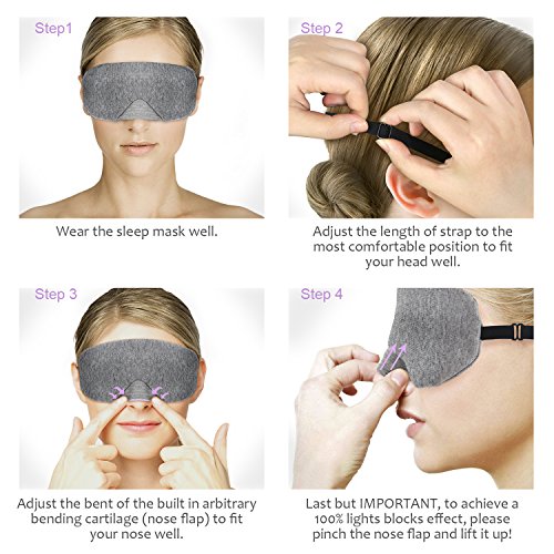 Step1: Wear the sleep mask well. Step2: Adjust the length of strap to the most comfortable position to fit your head well. Step3: Adjust the bent of the built in arbitrary bending cartilage (nose flap) to fit your nose well. Step4: Last but IMPORTANT, to achieve a 100% lights blocks effect, please pinch the nose flap and lift it up!