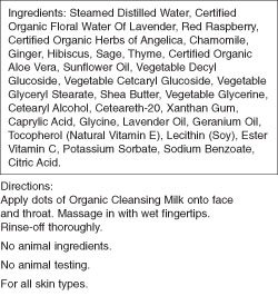 Directions Apply dots of Organic Cleansing Milk onto face and throat. Massage in with wet fingertips. Rinse-off thoroughly.