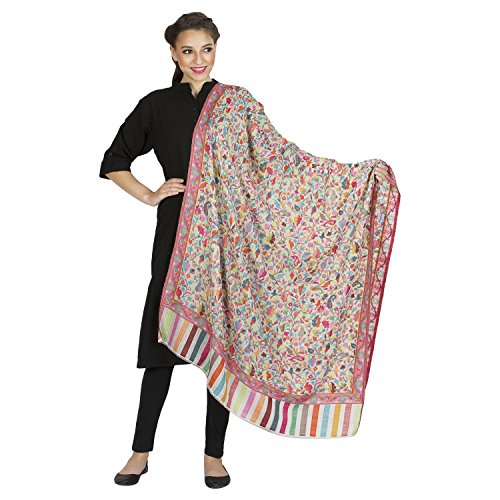 Studio : La Vastraa Publisher : La Vastraa Product Description This is a White Kani Shawl with Bright floral design weaved all over. It has small border in floral design on contrast pink color with multi color and flourscent stripes. The whole design is weaved on 100% fine wool, which gives pashmina feel to the fabric. The length of the shawl is 80 inches and the width of the shawl is 40 inches. 0