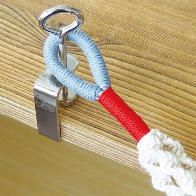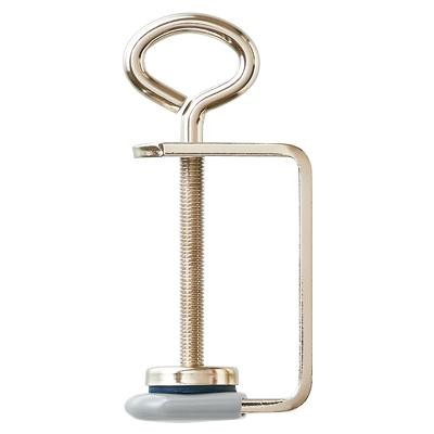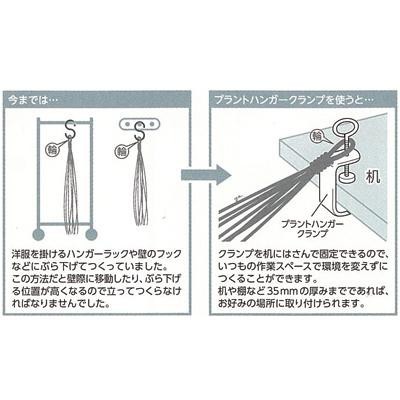 プラントハンガーは、基本的に作品の輪になった部分を引っ掛けた状態でつくります。プラントハンガークランプがあれば、机や棚などお好みの場所で好きな体勢で作品づくりに取り掛かることができます。机や棚など35mmの厚みまでであれば、クランプを取り付けられます。 |