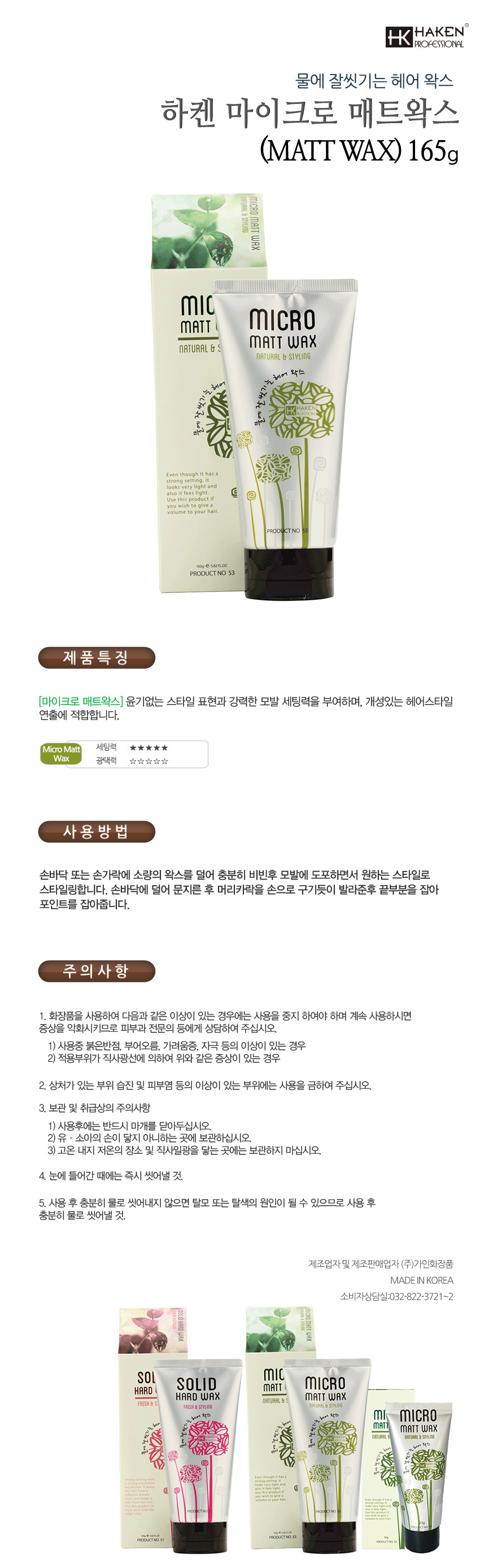 Manufacturer Gain cosmetics Country of Origin Republic of Korea Brand Haken Model Solid Hard Wax / Micro Matt Wax Description Help you change your look and accentuate hairstyle. Wax’s strong setting power makes you hold perfect hairstyle. Also, it is easy to wash off cleanly after regular shampooing and prevents dry and roughness. Product information Easy Washable Wax With Natural & Water-soluble Ingredients | Solid hard wax | – Strong Power Holding Wax Fixed Hair Firmly Without Stress And Sticky For The Least Hair Damaged. – Setting: ★★★★★ | Shining: ★★★★☆ | Micro-Matt wax | – Strongest Holding Matt Wax Without Shining For Short Hair. – Setting: ★★★★★ | Shining: ☆☆☆☆☆ Capacity – Solid hard wax: 165g – Micro-Matt wax: 165g or 50g Suggested Use Scoop out a bit of wax with your plams and fingers. Rub the wax and distribute it throughout your hair with crumpling motion and point out the end of hair to give more edge. Caution