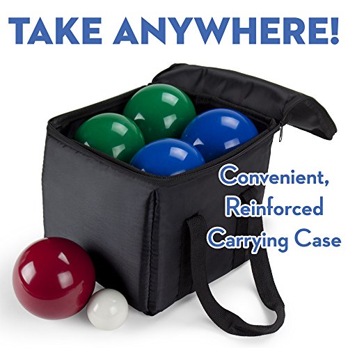 Studio : CSG Publisher : CSG Binding : Misc. Product Description It doesn't take much to play bocce. You bring the grass, sand, asphalt, or just about any flat surface, and we'll bring the balls! Bocce is a mix of bowling, croquet, and shuffleboard for 2-8 players of all ages. Score points by tossing your ball closest to the small target ball, or jack. But watch out, the other team may try to knock away your ball, or even knock away the jack! Ready to play yet? Why You'll Love It: Bocce has a long history and a low barrier of entry, which makes it a great choice for players of all ages. It requires minimal skill, and really can be played just about anywhere. And once a game gets going, the simple rule set that encourages ball contact means games get competitive quick! Our deluxe bocce set outfits four players, or four teams of two players, and features smooth poly-resin balls that lend an authentic look, feel, and weight. Each ball is 3.54" (90 mm) in diameter and weighs just over a pound and a half. Each set comes in a hardy reinforced nylon carrying case and includes a 1.5" white poly-resin jack. Instructions for playing and scoring are printed right on the box. 0