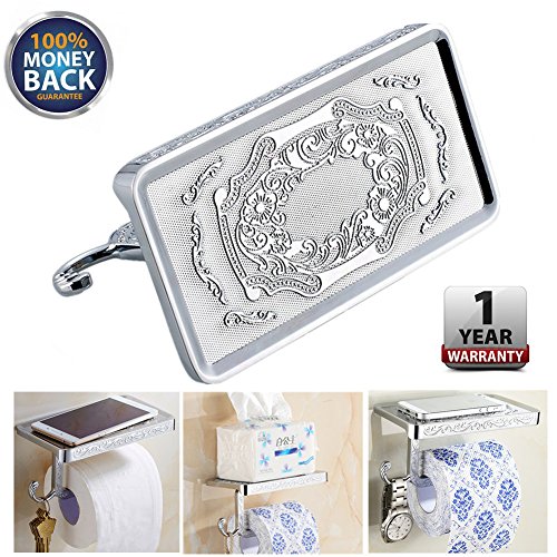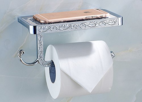 ★PERFECT HOME USE: The toilet paper holder shelf measures a generous 7.3 inches by 3.9 inches, allowing even the largest of cell phones to rest safely. Made of Zinc Alloy ensure quality and longevity.