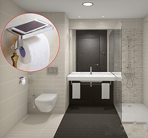 ★MULTI - FUNCTION: This Toilet paper holder with shelf holds cell phones, wallets, cigarettes and other personal belongings can be placed on it. Also the accessory hook will hold your towel.