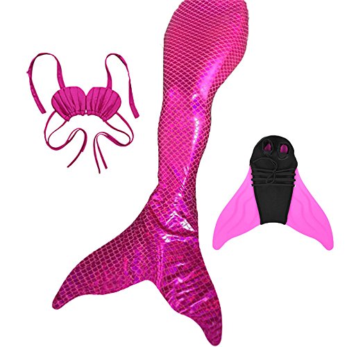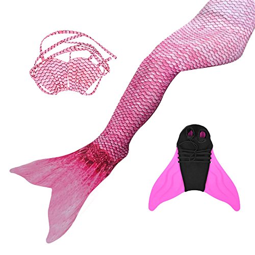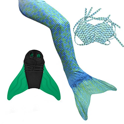 importand note: the top(Bikini) is only fit for the kids,it is not fit for Adult,thanks for your kindly understanding. Condition:New Material:80% nylon 20 spandex Package Included: 3pcs set (mermaid tail with top Monofin) Feature of the Monofin: The Monofin includes an engineered flexible, unbreakable polypropolene insert with a dive grade neoprene cover. The Monofin is buoyancy neutral, it won't sink you down. Designed for maximum propulsion, while maintaining a mermaid shape. Feet are not strapped in, making removal in the water easy; a tug, a kick and you're out! How to measure the size of the mermaid: Please measure to ensure accuracy in sizing. Waist measurements are measured at the waist. Length measurements are measured from the waist to the ankle. The Years and the height are only for Reference,please check the detail measurement well before purchasing,thanks. Detail measurement of the Mermaid tail: 4-5 Years,Waist 14.04-21.06 inches, Length 37.05 inches,For Height 43.3" 5-6 Years,Waist 14.32-22.62 inches, Length 39 inches,For Height 47.3" 6-7 Years,Waist 15.6-24.18 inches, Length 40.95 inches,For Height 51.2" 7-9 Years,Waist 17.16-25.74 inches, Length 42.9 inches,For Height 55.1" 9-11 Years/Adult,Waist 20.3-31.2 inches, Length 42.9 inches,For Height 59.0" 11-13 Years/Adult,Waist 21.1-32.8 inches, Length 45.2 inches,For Height 61" 14-17 Years/Adult,Waist 24.2-34.3 inches, Length 48.4 inches,For Height 63" 0