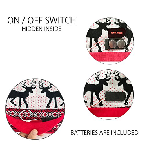 -. Feature : HIGH QUALITY: The light up beanie hat is made of soft Acrylic fabric, double knitted beanie, keep your head warm and feel blinking on your head. / COLORFUL LIGHTS:4 kinds of flashing mode, red, blue, and green led lights, fast flashing or slow light, all through a button to complete, colorful light up beanie hat / EASY TO USE: Click on/off built into band switch operation, requires 2 CR2032 lithium batteries in the batteries hatch and works for around 24 Hours in full use / ONE SIZE FITS ALL: Fits unisex adults / WIDESPREAD APPLICATION: Perfect for indoor and outdoor, festival, holiday, celebration, parties, bar, great beanie hat gifts for your families and friends