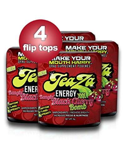 -. Binding : Health and Beauty -. Brand : TeaZa -. Department : health -. EAN : 0759309911936 -. Feature : The ultimate multi-purpose energy supplement for active lifestyles / A bold explosion of tart, spicy and sweet with extra caffeine and flavor. / Great for sports enthusiasts / Helps to quit tobacco products / Helps in suppressing appetite -. IsAdultProduct : 0 -. Label : Trim Nutrition -. Manufacturer : Trim Nutrition -. MPN : TEBBC4 -. PackageQuantity : 4 -. PartNumber : TEBBC4 -. ProductGroup : Health and Beauty -. ProductTypeName : HEALTH_PERSONAL_CARE -. Publisher : Trim Nutrition -. Studio : Trim Nutrition -. Title : TeaZa Energy's Bangin' Black Cherry Bomb 4 Flip Tops - Have More Energy Anywhere! -. UPC : 759309911936