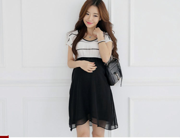 韩版宽松时尚辣妈孕妇装夏装上衣短袖条纹孕妇雪纺连衣裙