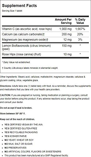 BUFFERED VITAMIN C 1000 mg with Bioflavonoids 150 mg - Vegetarian/Kosher. Country Life's Buffered Vitamin C has been prepared with natural alkaline Calcium Carbonate and Magnesium Oxide which buffer and neutralize the excess acidity of Vitamin C. This product has been formulated in a special base to release its nutrients over a prolonged period of time.