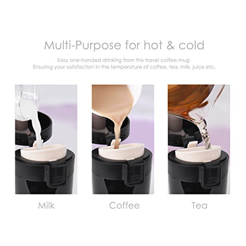 - 【HIGH QUALITY VACUUM MUG FOR HOT AND COLD DRINKS】 This double walled insulated stainless steel travel coffee mug designed to keep drink hot for up to 6-12 hrs and cold for up to 12-24 hrs depending on external temperatures and lid screwed right. Ensuring your satisfaction in the temperature of your chosen beverage such as coffee, tea, milk, juice etc.