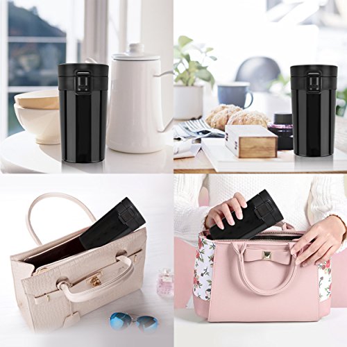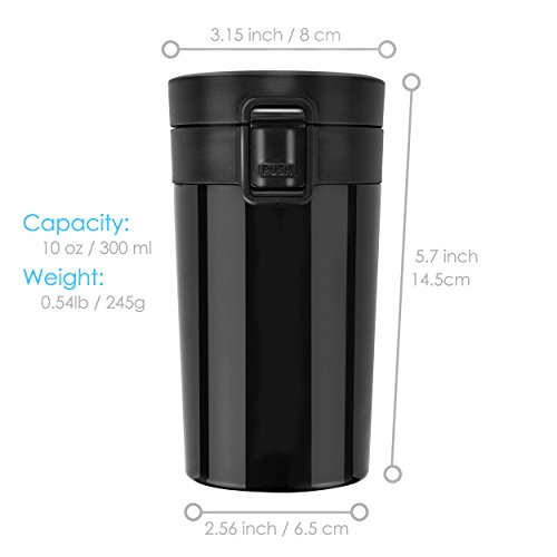 - 【PERFECT ON-THE-GO MUG】With 10oz/300ml capacity, it's small, compact and light. Product dimension: 5.91 "(L) x 3.15 "(H) x 2.56 "(W) and weights 9.88 oz, just the perfect size to fill up and run out for errands. When the lid is screwed on correctly, it's 100% leak proof. Whether you are a coffee lover or a tea lover, you can take this great travel mug to keep drinks hot or cold, great gift for commuters.