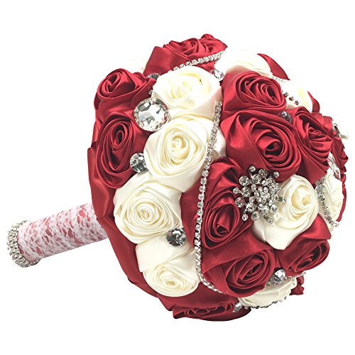 TOP DESIGN - all the roses are made of satin, bcaked with green leaves,the handle of the bouquet is wrapped by lace, decorated with large and small sparkle rhinestones, all of the elements will fit in your wedding perfectly.